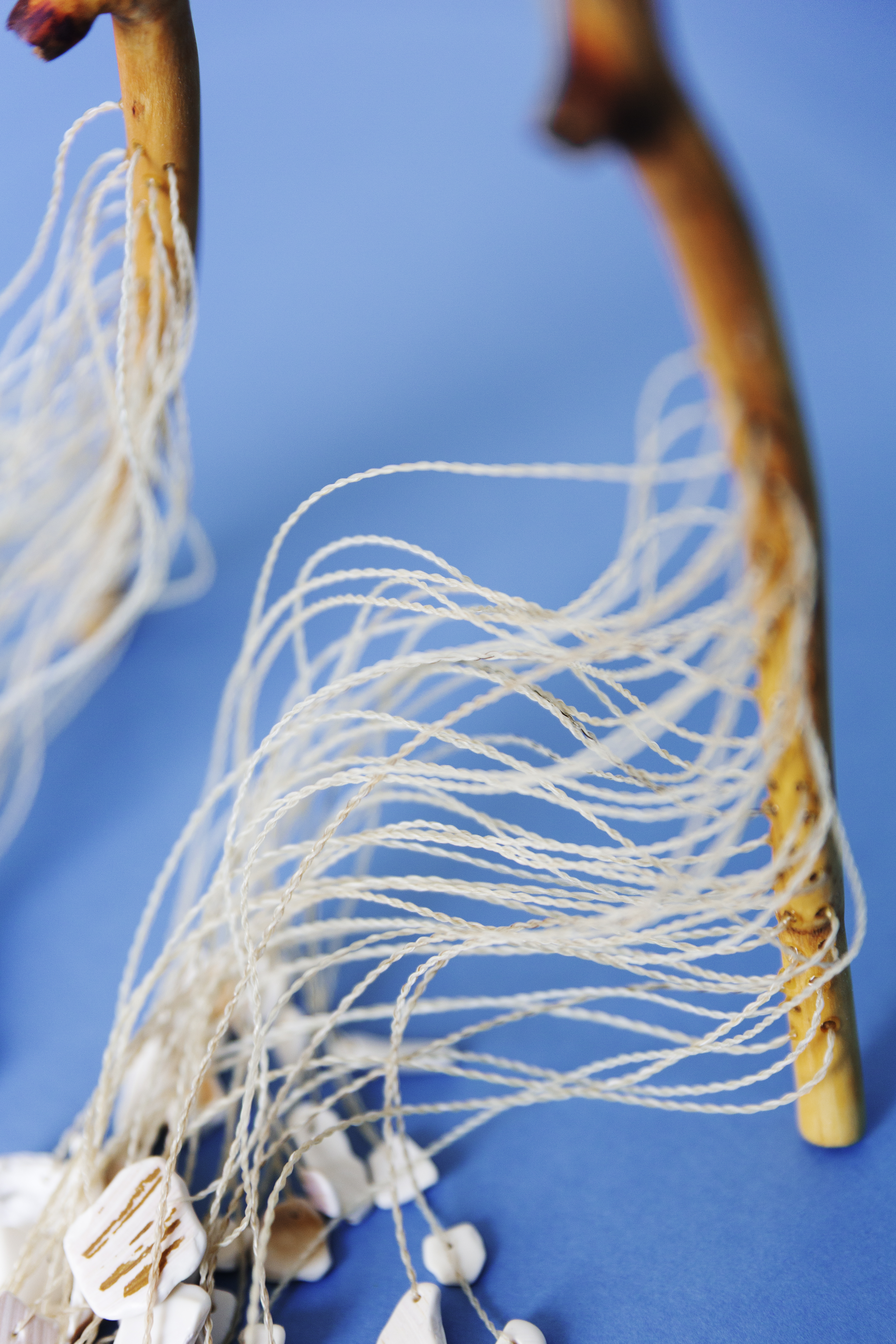 Wood, horse hair, sea shells, cotton ribbon.
